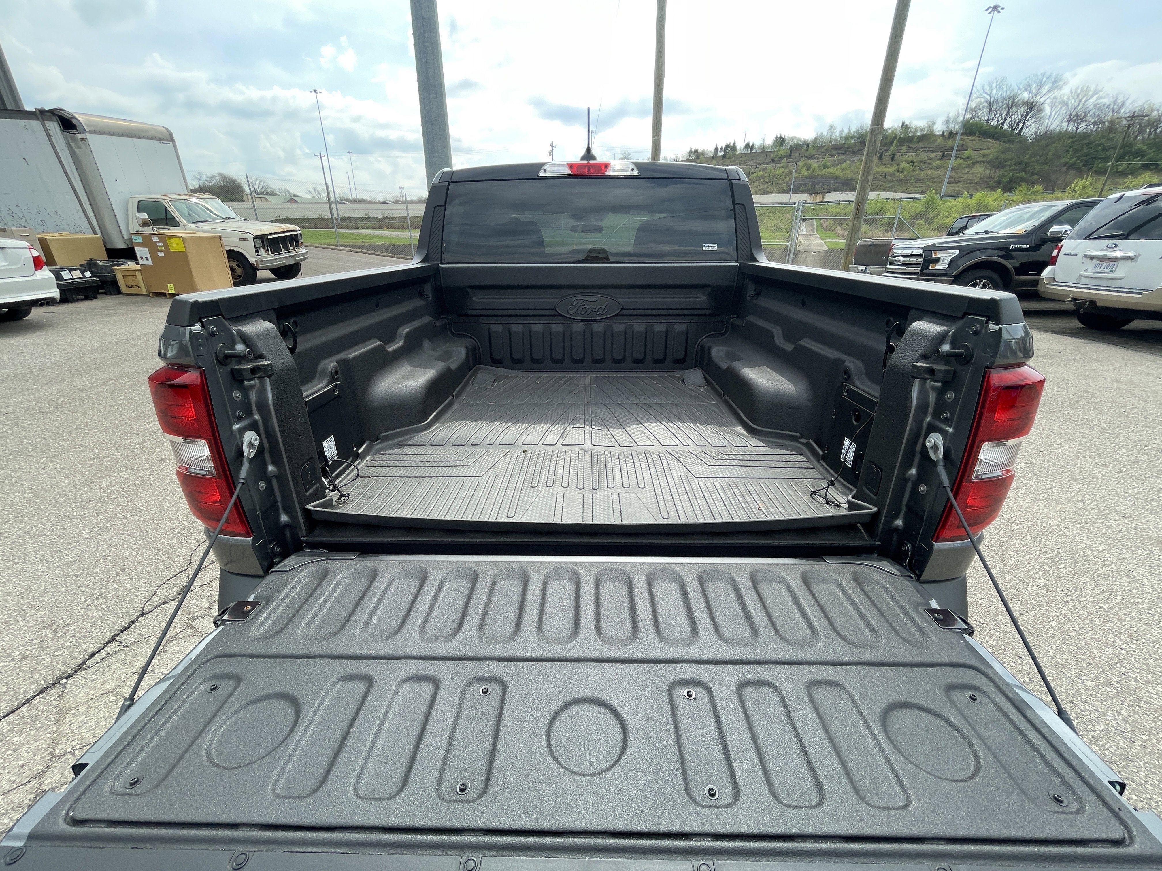 2.91 Axle Ratio, 4-Wheel Disc Brakes, 6 Speakers, ABS brakes, Air Conditioning, Alloy wheels, AM/FM radio: SiriusXM with 360L, Apple CarPlay/Android Auto, Auto High Beams, Auto High-beam Headlights, Automatic temperature control, Black Appearance Package, Black Grille, Black Interior Accents, Black Painted Mirrors, Brake assist, Bumpers: body-color, Compass, Delay-off headlights, Driver door bin, Driver vanity mirror, Dual front impact airbags, Dual front side impact airbags, Electronic Stability Control, Emergency communication system: SYNC 4 911 Assist, Equipment Group 302A, Exterior Parking Camera Rear, Four wheel independent suspension, Front & Back Black Edition Ford Logo, Front & Rear Floor Liners w/o Carpet Mats, Front anti-roll bar, Front Bucket Seats, Front Center Armrest, Front reading lights, Fully automatic headlights, Illuminated entry, Internet access capable: FordPass Connect 5G, Knee airbag, Low tire pressure warning, Occupant sensing airbag, Outside temperature display, Overhead airbag, Overhead console, Panic alarm, Passenger door bin, Passenger vanity mirror, Power door mirrors, Power steering, Power windows, Pre-Collision Assist w/Automatic Emergency Braking, Radio data system, Radio: AM/FM Stereo w/6 Speakers, Rear anti-roll bar, Rear seat center armrest, Rear step bumper, Rear-View Camera, Remote keyless entry, Security system, SiriusXM w/360L, Speed control, Speed-sensing steering, Steering wheel mounted audio controls, SYNC 4 w/Enhanced Voice Recognition, Telescoping steering wheel, Tilt steering wheel, Tough Bed Spray-In Bedliner, Traction control, Trip computer, Unique Cloth Front Bucket Seats, Unique Cloth Front Bucket Seats w/Black Appearance, Wheels: 17 Carbonized Gray Painted Aluminum, Wheels: 19 Black Painted Aluminum.